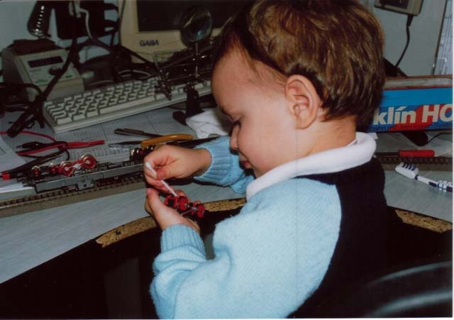De lehet használni a klasszikus fülpucoló pálcikát is tisztítgatni. A képen az akkor még 2,5 éves nagyobbik fiam egy OFF méretű Märklin-Hamo E52 kerekeit tisztítja így.