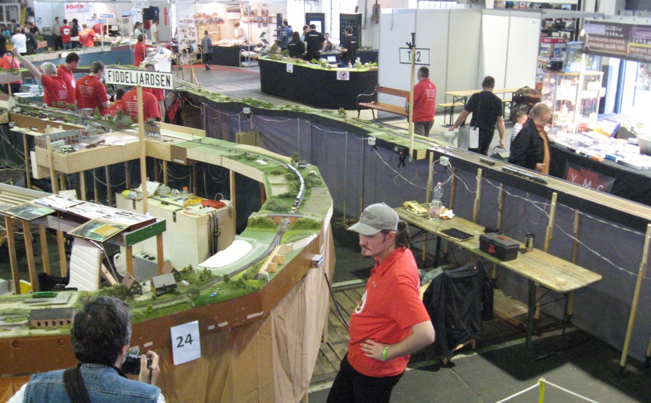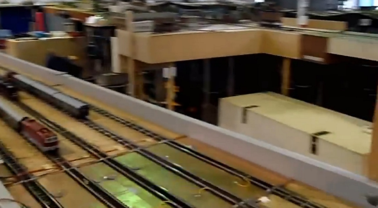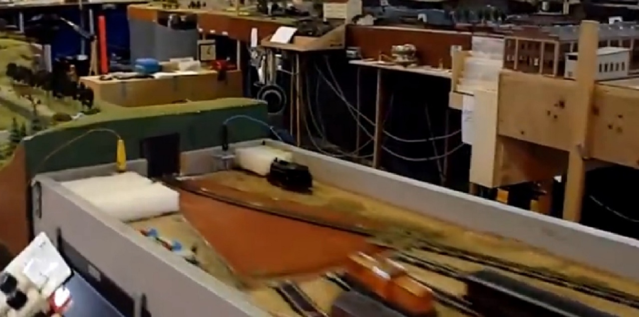 A kérdéses rész "Fiddleyardsen" nevű tárolóállomás, melynek a váltókörzetét nagyon ötletes módon egy flexibilis vágány segítségével oldották meg. a bejárati részen van rögzítve, a talpfarácsozata meg van ritkítva, a mozgó vége pedig egy körív vájatban kényszerpályán tud mozogni. Mozgatás közben a vágány mindig a legideálisabb ívet veszi fel. Itt, szemben a húzogatós tárolóval, minden vágány állandóan be van kötve a hálózatba, vagyis lehet mozgatni a járműveket. |