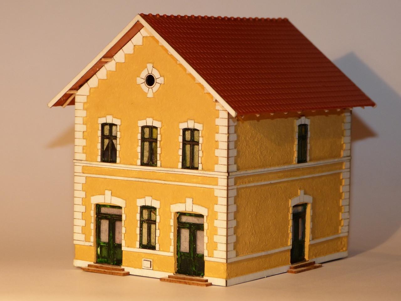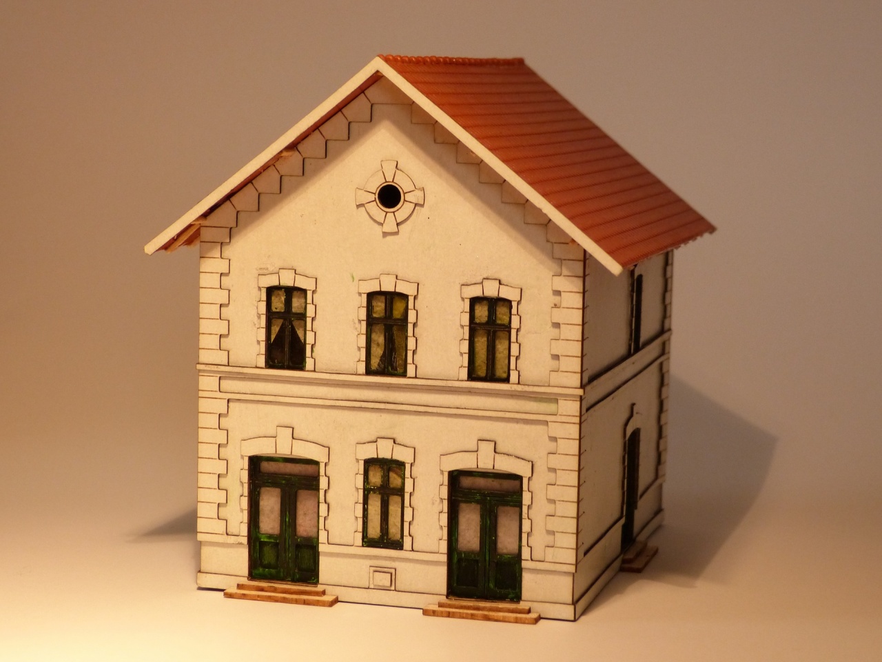Így jelenthetem, hogy a harmad osztály sorozat éretté vált. Természetesen minden helység megvan mint az eredetin és külön világítást is kapott. Lehetőség van világítás vezérlő elektronikát beépíteni, így az épület önálló életet élhet. A tető, a kúp és az eresz Auhagen.