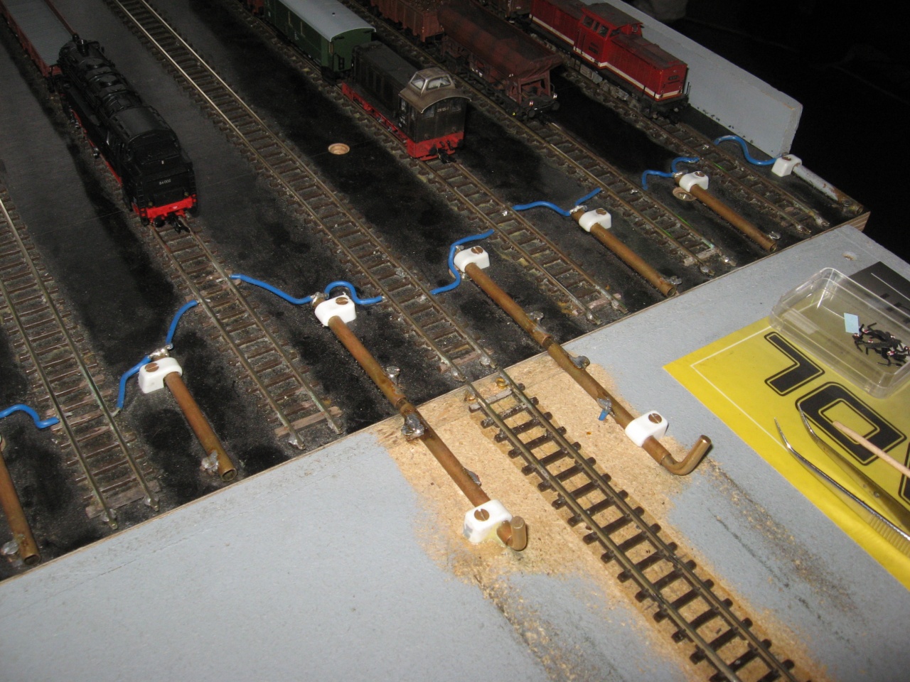 A másik tárolót Gashpy részletesen leírta, csak annyit tennék hozzá, hogy a szegmens váltó és kettő tárolóvágány két féle nyomtávot képes fogadni! Ez jól látható ez egyik képemen. Be van építve a keskeny nyomközre is egy sínszál.