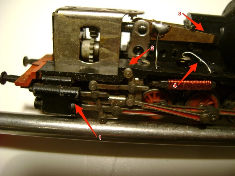 Ha a kasztni lent van, jobban látod a kopásokat az 1-essel jelölt részen, majd nézd meg, hogy nincs-e repedés, vagy túlerőltetés nyoma a 2-essel jelölt részen. Itt a lényeg, hogy a rudazatot tartó fémpöcök oldalról csak szimplán bele van nyomva a műanyagba, és ha sokat volt ki/be mozgatva akkor akár szimplán kijár vagy kiesik. Ha a főkeret piros, akkor a csap hosszában "kifehéredik" az anyag ha túl sokszor volt mozgatva. 3-as helyen vizsgáld a szénkeféket, ha még kiáll a kocka, akkor vagy új vagy viszonylag keveset ment a mozdony, ha a motor oldalával szintbe van, az gáz. A 4-es helyen nézd meg, hogy a motortartópöcök meg van-e, na nincs, akkor nyilván már motor is kiszedték valami miatt. Szintén erre utal, ha a fojtótekercs így lóg mint a képen, a gyári állapotban ez majdnem vízszintes.
