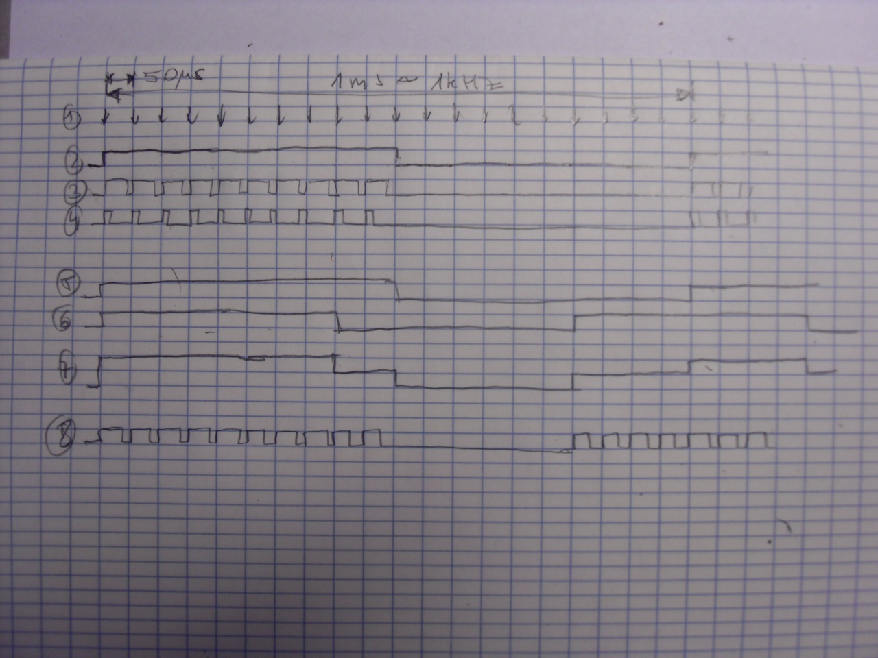 az 5. és 6. jelet összeadva jön létre a 7. jel(így működik a TFD-s kapcsolás).Ezt lemintavételezve egy pwm kitöltése van modulálva(8.jel). A szép hanghoz a fizika hangközöket kell választani és a tmr2 it-t is jól kell kezelni.