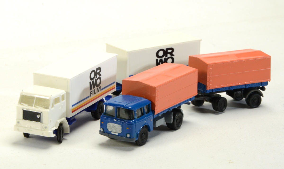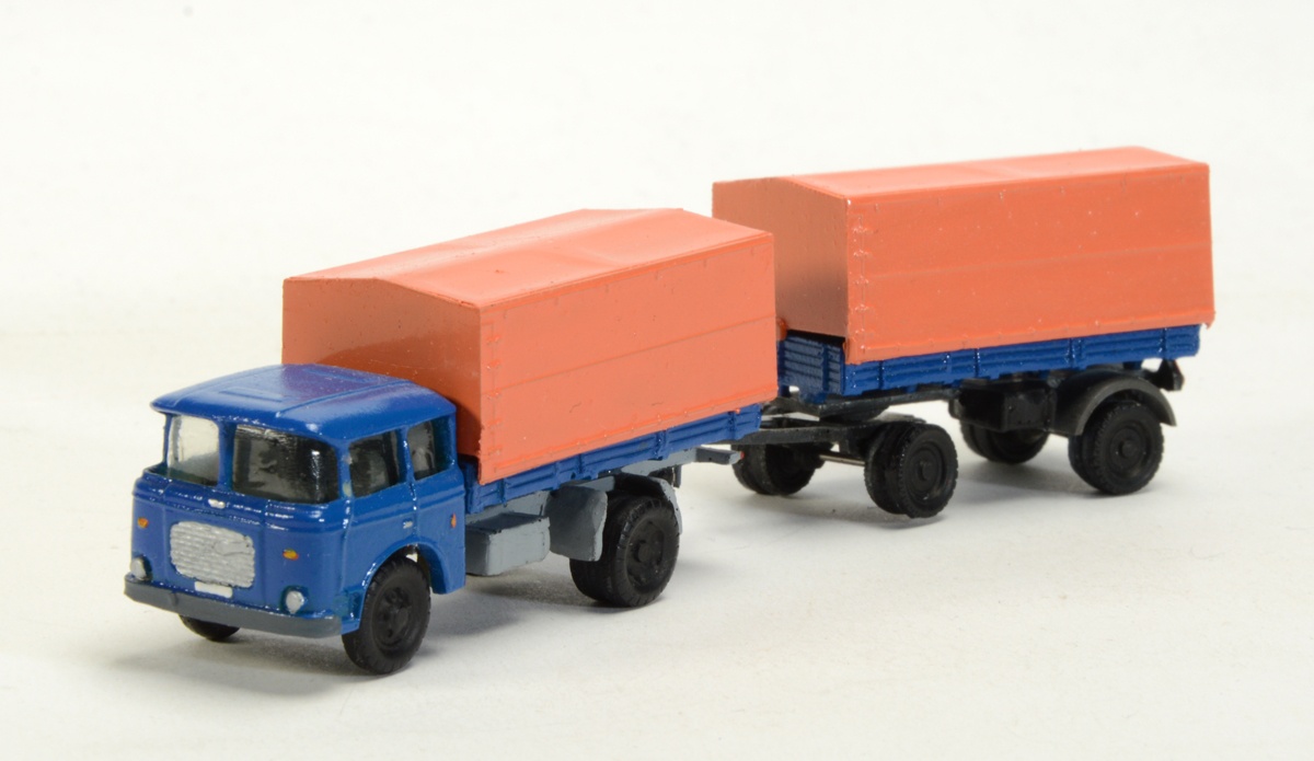 Kézbe véve a két modellt, viszont azt kell mondanom, hogy csúnyák. Kár érte, mert hiánypótló mindkettő. A Gabor Volvo igényesebb, gyantaöntvény, ügyes megoldásokkal (átlátszó tömb a vezetőfülke, hasonlóan az AP Modellhez, de itt ez egy betét, ami az öntvény kasztniba belecsúszik, aztán "kormányozható" kerék és szép tamponnyomás), de pl. nem forog a kerék és nem nyithatók a dobozajtók. A Jano Skoda is gyantaöntvény, de torz, a plató és ponyva a jól ismert Ifákról való, a festés borzalmas. Ez egy korai darab lehet, mert ma már nem kínálják.