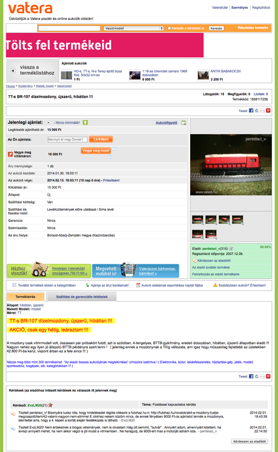 Sajnos a vatera nevű aukciós portál az égvilágon nem tesz semmit a tisztességes üzletekért. A magam, részéről én évek óta negligálom, ugyanis benyelték a regsztrációs sápot tőlem, de azóta sem tudnék eladni a portálon... No comment.