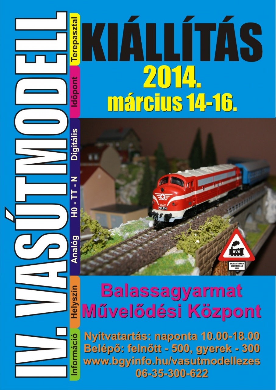 Tisztelt ÁpolTTársak, Szeretnélek meghívni titeket a Balassagyarmati Vasútmodellező klub IV. kiállítására. Látható lesz Bencs Zoli új modulokkal kibővített asztala, valamint a Liszt Ferenc Euro-City Vasútmodellező Klub 30m-es modulrendszere.