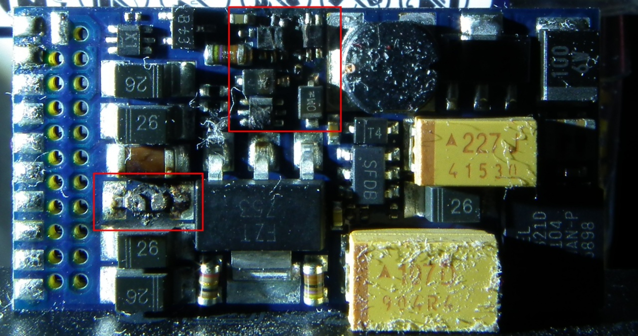 A mellékelt képpen amúgy egy elrettentő példa: egy ESU LokSound egy OFF JC Taurusból, ami egy PIKO FZ1 trafóról lett hajtva. A bal oldali szénné égett helyen eredetileg egy 27V-os (sic!) Z-dióda volt... A másik füstölt alkatrész csoport a hangrész processzorának a tápellátásáért felelt eredetileg.