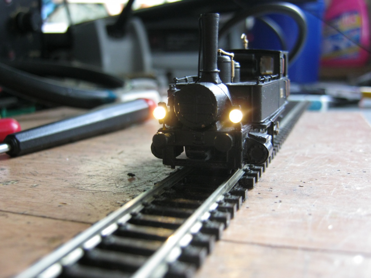 A beszerelt Tran dekóderhez nem kell hozzányúlni, ha futtatjuk a modellt, szépen, rángatásmentesen gyorsít és lassít, a modell áramfelvétele gyorsításkor 16V sínfeszültség mellett kb. 170mA DCC üzemben, állandósult sebességnél 3 kéttengelyes BTTB kocsival 100mA, világítás nélkül. Írtam, hogy a világítása már kis feszültségről, analógban is szépen megy, de digitális üzemben a fényerő már túl nagy lesz, ami egy régi gőzös esetében eléggé stílustalan. Érdemes a dekóder fényerejét csökkenteni. Tran dekóderek esetében ehhez két CV értéket kell átprogramozni. A CV57-ben kiválasztjuk a funkciót, aminek a fényerejét csökkenteni szeretnénk, jelen esetben ez az előre világítás, vagyis a CV57=1. Utána a CV54-ben %-ban határozhatjuk meg 1-100 között a fényerőt. Éretelemszerűen a 100 a maximális érték, 1 a minimális. Én 10%-t állítottam be, vagyis CV54=10. Ezzel a fényerő már szép, nem két légvédelmi fényszóró világít a régi kis gőzösön...  |