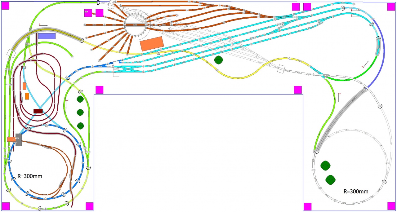Én egyet változtatnék rajta: a látható nyílt vonali részeken megnövelném az ívsugarat. Lehetőség van rá, szerintem 300mm helyett a 396-ra is (Nem beszélve arról, hogy a modern Tillig járművek egyre inkább 310mm legkisebb ívsugárra készülnek.) |