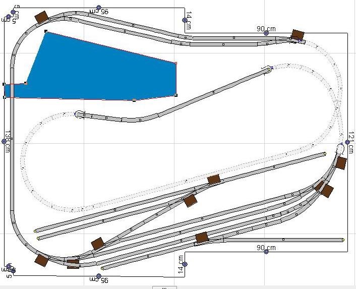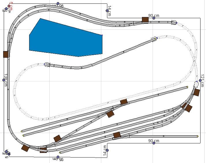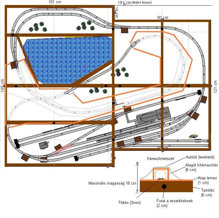 Sok-sok méricskélés és árlista böngészés után átterveztem a pályát. Az alapkoncepció maradt: 3 átmenővágányos állomás amiből kiágazik egy kétvágányos tároló és annak a kihúzója, alul szintén hasonló elrendezésben a mozdonyok tárolására szolgáló "Z" jellegű csonkák. Felül a keresztekhez (hogy a vonatot ott lehessen pihentetni kicsit és ne jöjjön azonnal vissza az állomásra) egy kétvágányos kis állomás ami mellett fő motívumként a tó (elképzelés szerint strand lenne belőle) és mellette két alagút között a "nyílt pálya", hogy ne csak rendezgessem hanem menet közben is lássam a szerelvényeket...