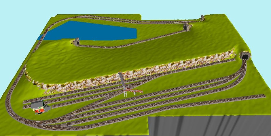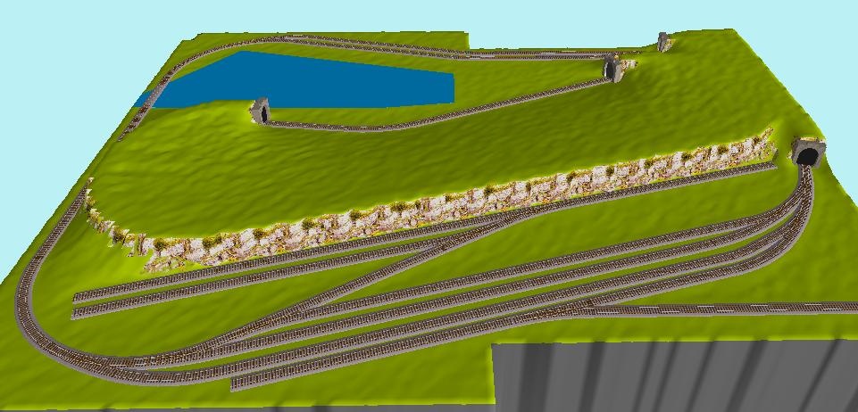 Én a kétvágányos állomást elhagynám, az onnan kigördülő szerelvény vége még az állomáson van, az eleje már a három vágányos állomáson. Ha meg akarod állítani a vonatot valahol, akkor inkább a hegy gyomrában lehetne egy megkerülő vágány. Bemegy a személy vonat, kijön a tehervonat. Lenne meglepetés azoknak akiknek dicsekszel az "asztallal". A tavat tápláló csatornát viszont építenék az asztal széléig, ami fölött egy kis hídon átmegy a vágány, a hídra vezető pálya egy kis töltésen mehetne. (Persze sztorno az egész, ha nálunk veszed a sineket, mert akkor feltétlenül vegyél még 4-5 váltót, sőt hózentróger váltót is  ) |
