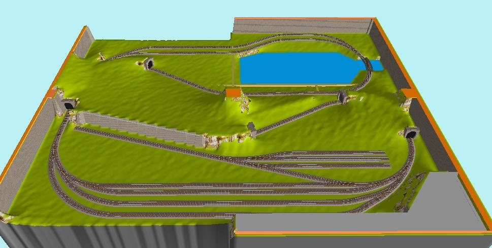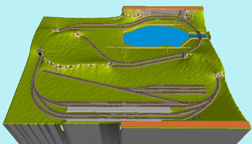 - sokkal szebb, valósághűbb lenne, ha egy kisebb patak, vagy folyó folyna egy innen nézve szép kanyarulattal, és két vasúti híd menne át felette. Egy ott, ahol most is van, egy meg ott, ahol amúgyis van egy bal/jobb ív a két vágányban, közötte az egyenes szakasz alatt. (Igazából azt a kjétvágányos állomást én elhangynám, és egy sima megállóhelyet tennék oda.) |