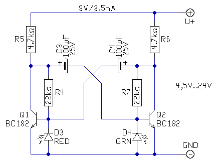 3. Átmenetileg rakj be kisebb kondikat ( 1-10uF) ilyenkor mindkét LED világitani fog - valoban gyorsan villognak. Ha ez a helyzet, akkor jobb minöségü kondik kellenek, vagy nagyobb ellenállás a bázisokbol a +4,5 voltra.( 10k helyett 30-50 k Ohm).