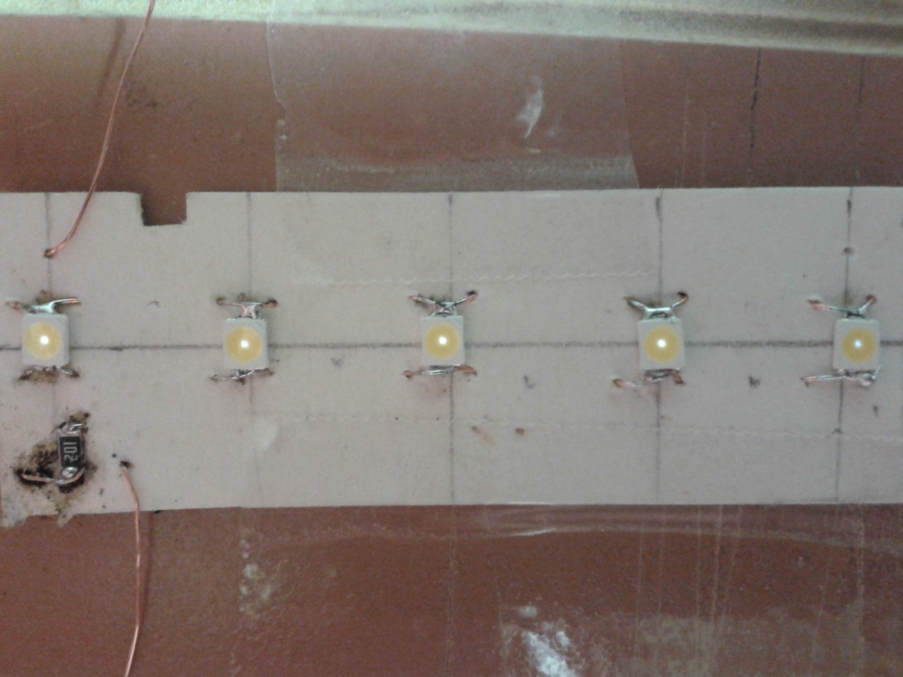 A ZPD5.1 500mW-os, összesen kb. 2 mA folyik be a LED-ekbe, ez úgy oszlik el, hogy nem látszik a fényerőváltozás.. Persze tisztségesebb lenne minden LED-el sorba egy ellenállás, de van szabad kapacitás a válogatásra