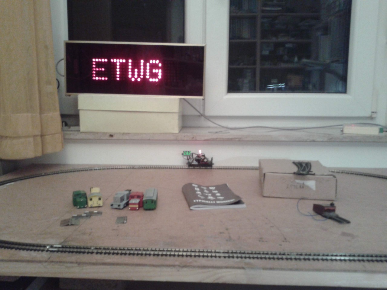 Kb. két éve raktuk össze a roncsokat. Anno leköszörültem egy reszelőt, hogy a sínvégekbe is be tudjak nyúlni. Elég sok helyen összekötöttem a síneket, Váltógyártó művész úr fogójával is nyomkodom, aztán mégis van olyan hely, ez sztochasztikusan változik, ahol esik a feszültség, de a legnagyobb gond a kitérőkkel van, elsőrangú szervóhajtás váltja, polarizált, de csúnyán billegnek a kocsik, és csak azért nem siklanak ki percenként, mert mindegyikre raktam plusz 10-20g súlyt. Persze nem lehet „nagy” sebességgel hajtani, e tekintetben jól modellezzük a M.o.- i állapotokat.