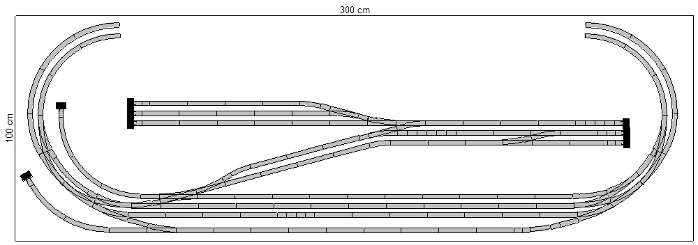Mit szólsz az alábbi módosításhoz? Egyszerűsítettem egy kicsit. A váltók átpakolásával és ritkításával megnyúlt a hasznos állomás hossz. Az asztal méreteidet nem ismerem, ezért más az arány. Ha mondjuk a kulissza mögé nem tennél tároló vágányokat, hanem levinnéd az asztal alá, több tárolási lehetőséged lenne és a vonat sem érkezne pillanatok múlva vissza az állomásra. Nekem még mindig az első terved tetszik, kis reszelgetéssel egész jó állomást és vonalvezetést lehetne kihozni belőle. |