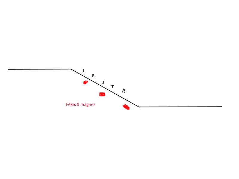 Én abban látok egy megoldást, ha a vágány alá olyan erősségű mágnest raksz, hogy attól épp nem áll meg a vagon, de kellő sebességgel továbbgurul. Minden tengely mágnesezhető, minden új forgóváz is, tehát lassulás várható. Valahogy így képzelem el: (móriczkarajz). A kis piros bumszlik a fékező mágnesek. Persze ez így nem élethű, de lassít. Ja és a legjobb az elektromágnes, hogy szegény gurító mozdonyt ne kínozzuk a felmenetelben. Felmegy a vonat, bekapcsolod a fékező elektromágneseket, legurul az összes kocsi, kikapcsolod, és a mozdony is mehet lefelé.
