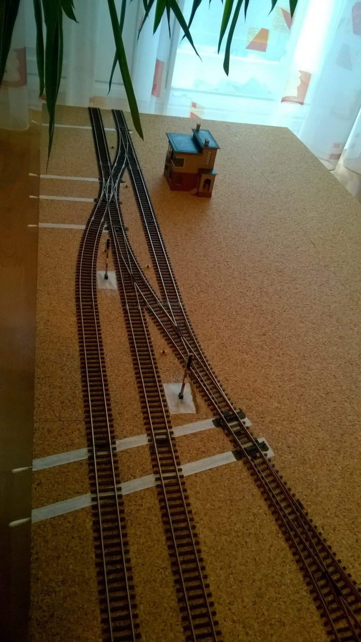 A kijárat átépült kétvágányosra, azaz arról csatlakozik a 34 mm-es nyílt vonali modulokhoz. Mivel ez a két átmenő is egyben, így követnie kellett az állomási geometriát, majd a másik oldalán pedig összehúztam a 34 mm-re. Érdekessége, hogy ez vágánytengely eltolással is járt, nem csak a távolság szűkítésével, de úgy, hogy bekerült egy hózentróger is. Nem olcsó és kicsit beteg mutatvány, de nem estem kétségbe és gondolkodás nélkül megcsináltam, mindösszesen 80 cm-en. Azóta is működik.  |