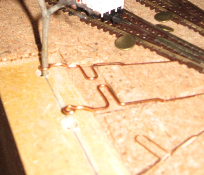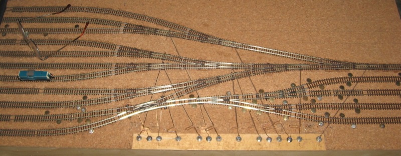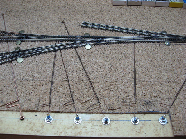 Konkrétan Gabitó állomás után a hurokra vezető Y váltó átkapcsolása ezzel a kapcsolóval történik. Mind mechanikus, mind pedig elektromos módon. A kapcsoló kis szárát átfúrtam, kapott egy Z huzalt, ami mozgatja a váltót, a kontaktus pedig a polarizálást végzi. Amikor jön a vonat, akkor vezetője fogja és kapcsol egyet, így a lehető legegyszerűbben zajlik a váltóvezérlés. |