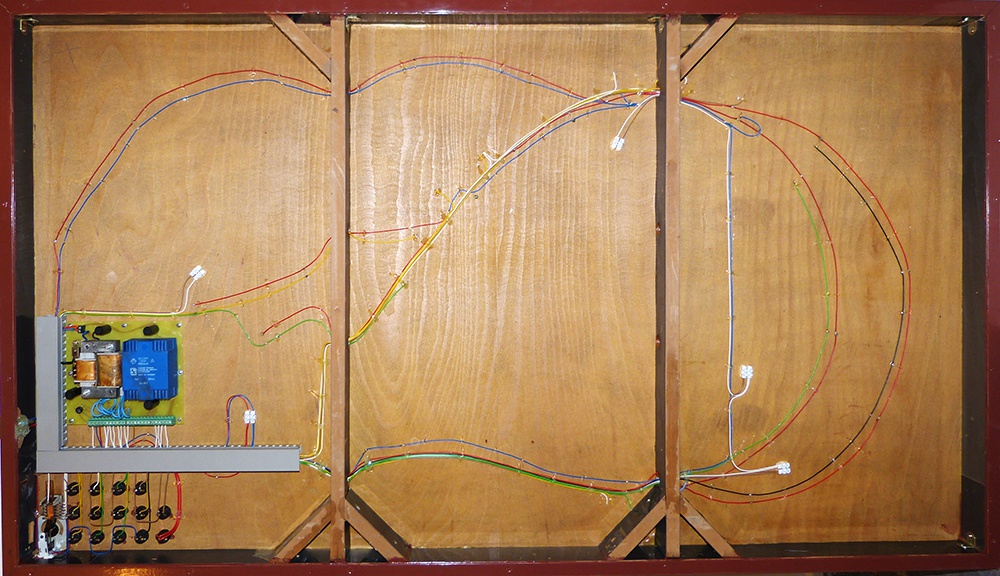 Nos mily véletlen, a huzalozás tömör vezetékkel készült. Maradt rengeteg 2x4x0,8 jelzőkábel, néhány folyóméternek találtam is helyet. Mint mondottam neked találkozásunkkor, régi BTTB sínt használtam. Minden egyes sínre alulról ráforrasztottam egy darabka vezetéket. Majd azokat szintén ráforrasztottam a sínek alatt futó "gerincre". (piros-kék). A sorkapcsokba világítás lett kötve. A Puskás trafó adja a világítás és a váltók tápját, míg a másik trafó egy régi F1 átépítés. Az egész le van zárva egy pozdorja lemezzel, így a kisember még véletlenül sem tud hozzáérni.
