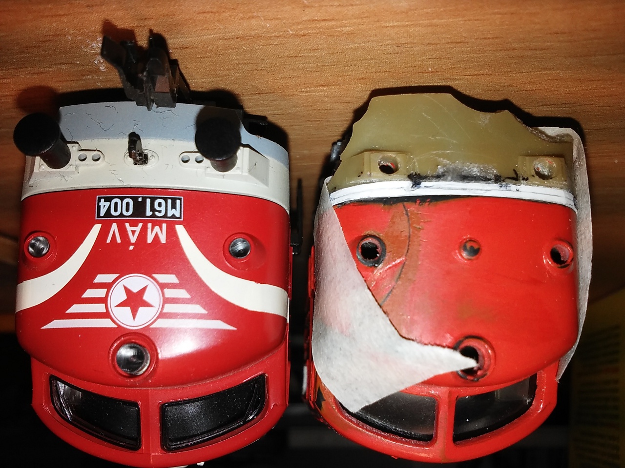 Sok olyan nem Tillig Nohabot láttam, amin a tulaj/mester eltüntette a forgó szoknyát és a kasztni-szoknya közti hézagot úgy, hogy egyszerűen a szoknyát levágta és felragasztotta az alvázra. Csalás lesz így viszont, mert az ütközők egy egész milivel feljebb kerülnek, illetve a kupplung is egy milivel magasabbra kerül. Ezt kiküszöbölendő Enigmától kapott műanyag lap két rétegével pont betömtem a rést, és így minden klappol (a Tillig modellhez képest).