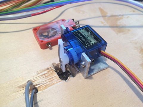 A képen az egyik frissen beépített szervó, mellette a polarizáló kapcsoló, ami később egy tolórúddal volt kapcsolva a szervó által. |
