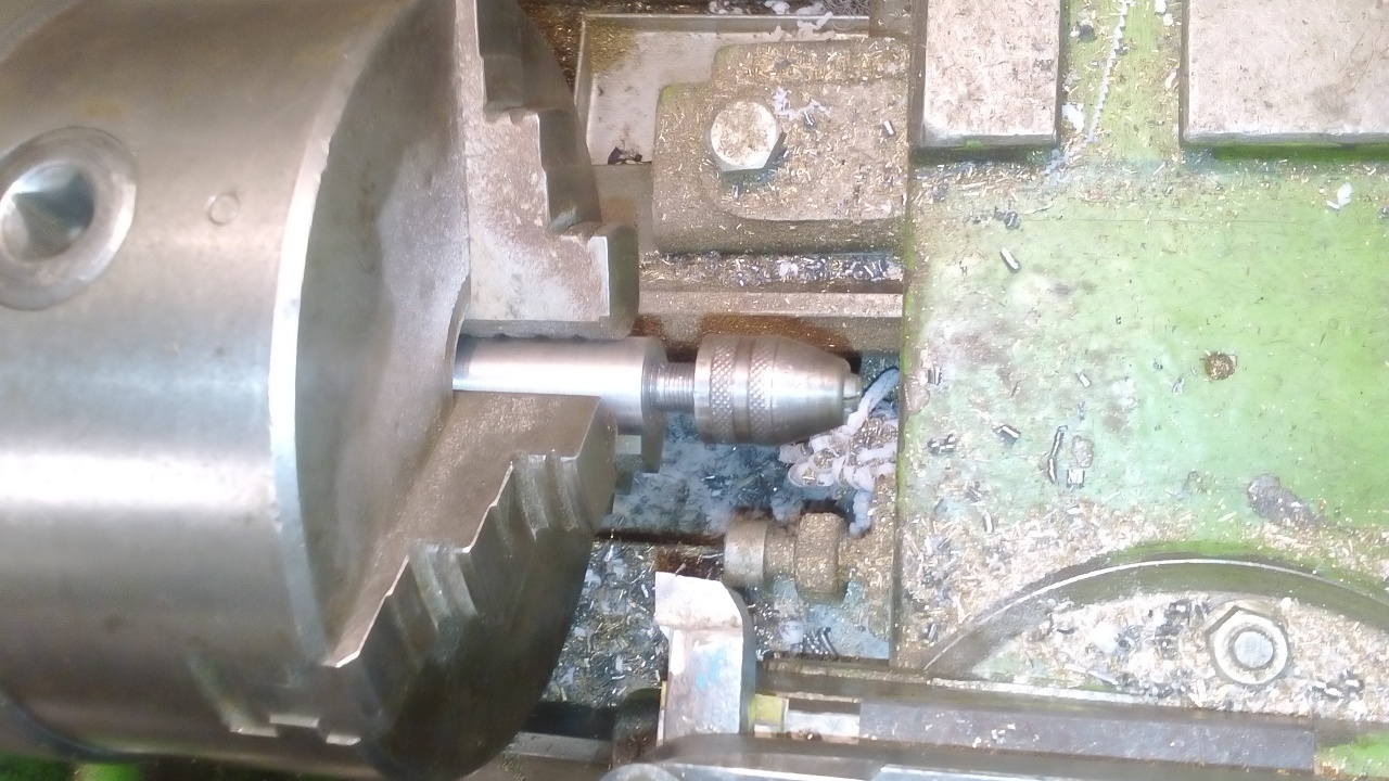 Ezt elcsaltam, mivel az egészet egy anyagból esztergályoztam+ a 3 db huzalt is be kellet fűznöm a belsejébe. ezért fúrtam egy 0,8mm es lyukat 2,5 cm hosszan, majd ezt követően leeszterályoztam 1,2 mm re a felső részt. mivel az eszterga tokmány 3mm-nél kissebb anyagot nem tud befogni, ezért a Proxon tokmányhoz csináltam egy adatpetr. így 0,4-3,2mm anyagot is be tudok fogni.