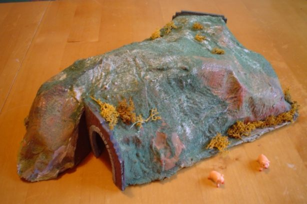 Szitával finom többszinü port szorni a vizszintes, elöre megragasztozott felületre, némi bokrok meg szinek csak jot tesznek.