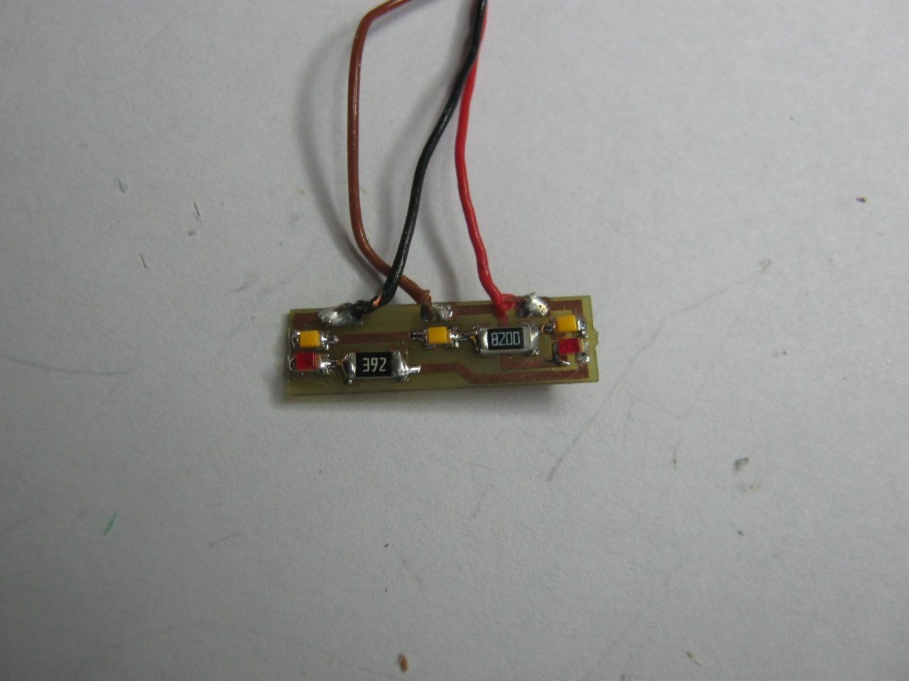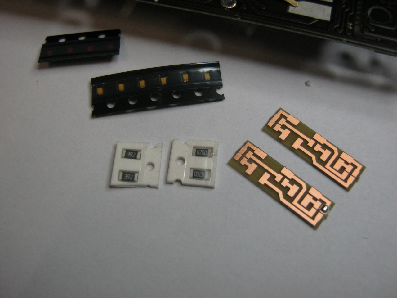 A készletben van két kisméretű SMD panel, 6db 0603 méretű fehér, és 4db 0603 méretű piros LED, valamint 2-2db 1206 méretű előtét ellenállás. Ezeket nekünk kell ráforrasztanunk a panelre. Ez nekem nem okoz gondot, de modellvasuti körökben ez azért nem gyakori, hogy 0,2mm-es hegyű, szabályozható páka is van. További baj, és ez nálam komoly hibapont, nincs semmilyen felületkezelés a paneleken. Lötstop, de még egy fránya hideggalván sem! A miheztartás végett (sokan szokták mondani, hogy " akkó' te meg mit csinátá' eddig") G.F. Rákoskeresztúr kolléga M41-eseihez a műhelyben készült világítás panelekkel együtt is lefotóztam egy "nagy" német cég drága termékét. Hogy melyik igényesebb kivitel, azt mindenki döntse el maga!