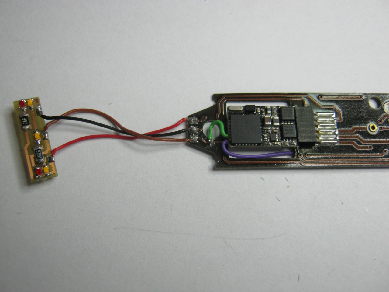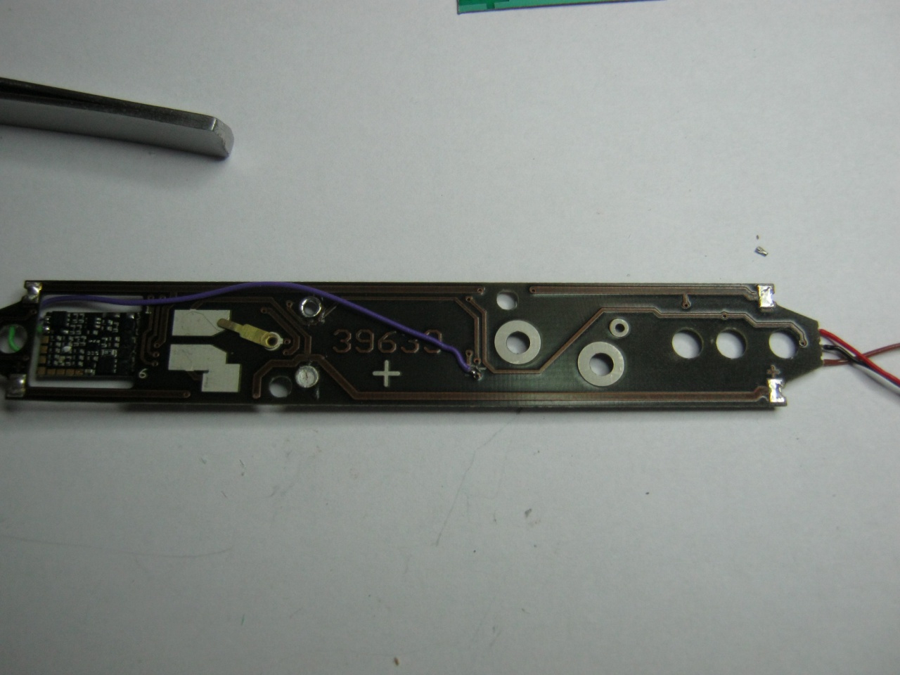 Tegyük be - szerintem Tran DCX76D/N, ZIMO MX621N, vagy 622N - dekóderünket, mert ezeknek van a világításon felül még két, teljes értékű tartalék funkció kimenete. A mozdony panelén kell két vágást tennünk, hogy átkössük a zárfényeket a két tartlék funkcióra. Ezek a zöld és a lila vezetékek a dekóderen.