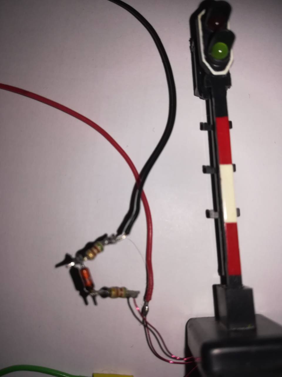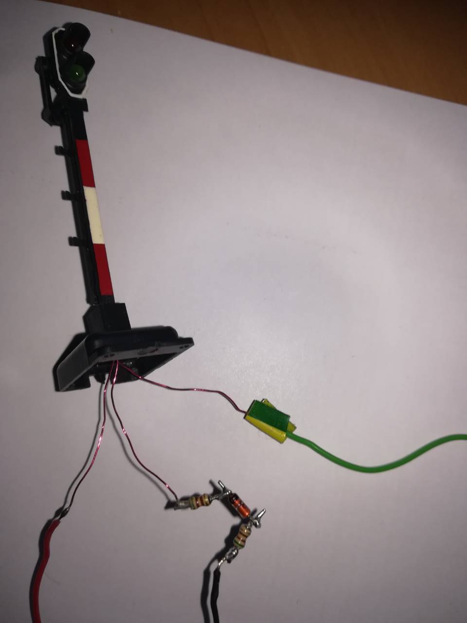 Az asztal nagyrészén önálló zápról mennek a LEdek, de itt most egykaros jelzőt használok vezérlésre és a visszajelzés csatlakozóira köttöttem a pir és zöd led egyik végét (R) a másik közös láb a 0 kapta. Kapcsolás nélkül világitott is rendesen a piros, csak szabadbjelzéskor ütött be a baj.