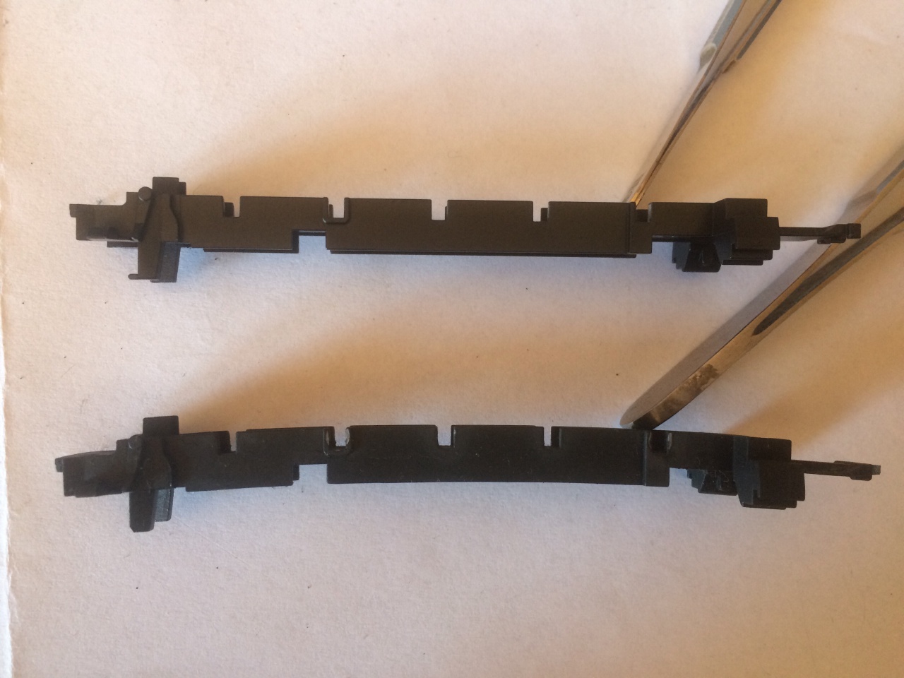 Az előző poszt második képén látszik a fém alvázkeret. Ebben vannak a kerekek, erre megy rá a panel, az áramszedő fedél, stb. Ha így megvan hajolva, akkor már nagyon pestises. A kezdeti stádium a sarkokon, éleken látszik, a festék felpattogzik, megrepedezik, a kiálló részek letörhetnek. Az egészséges fémen nem tudjuk letörni ezeket.