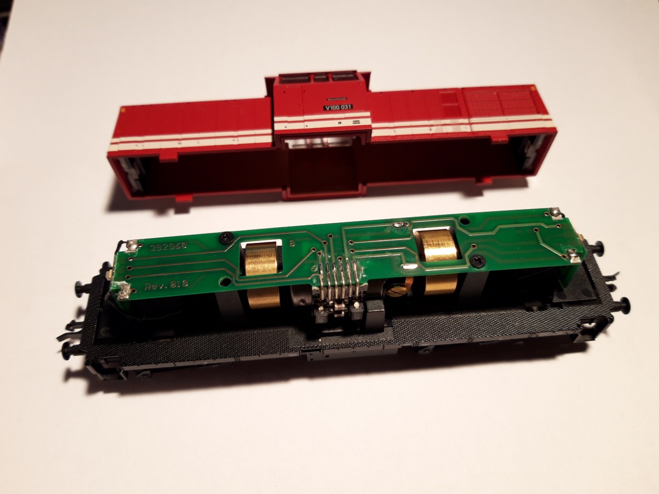 A 02506 dízelbe Plux12 dekóder tehető. A leírásában itt rajzos illusztráció is van, mert akár 6 tűs (NEM651) dekóderrel is használható a modell. Ez egy ötletes kialakítás, hogy kétféle csatlakozójú dekóder is használható, ami épp van kéznél. A kasznit a fülke ajtóknál kell széthúzni körömmel, 4 helyen, hogy le tudd venni.