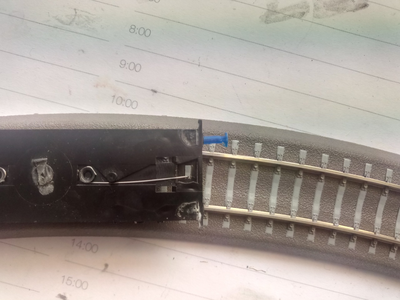 Tillig Modellgleis-ből van. Nem jön ki a geometria. Ha jobban megnézed, az állomás jobb oldalán, ahol van összekötés a két vágány között, az ív nem egyenletes sugarú. Ha ezt megismételném a bal oldalon is, azzal megnövelném az ív sugarát, így ezzel az asztal szélességét is. Márpedig azt meg nem lehet, ez a max méret, amiben lehet gondolkodni. Így is a legkisebb, 310mm-es sugarú ívek vannak használva.
