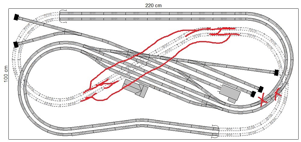 Ha az állomás mindkét végén lenne összekötés a két vonali vágány között, akkor, ahogy említettem vagy nagyobb asztal kellene, vagy sokkal rövidebb lenne az állomási vágányok hasznos hossza. Így is van benne egy nyúlfarknyi kis vágányka.