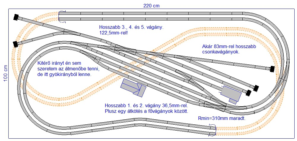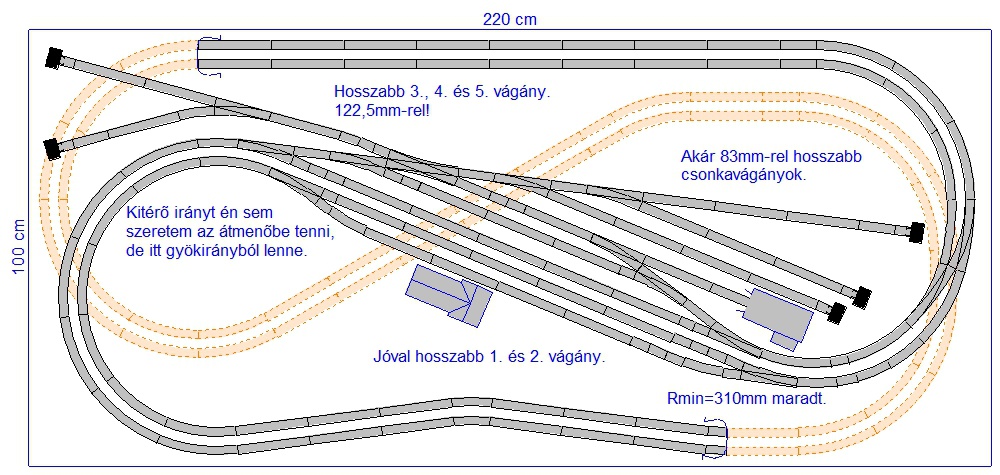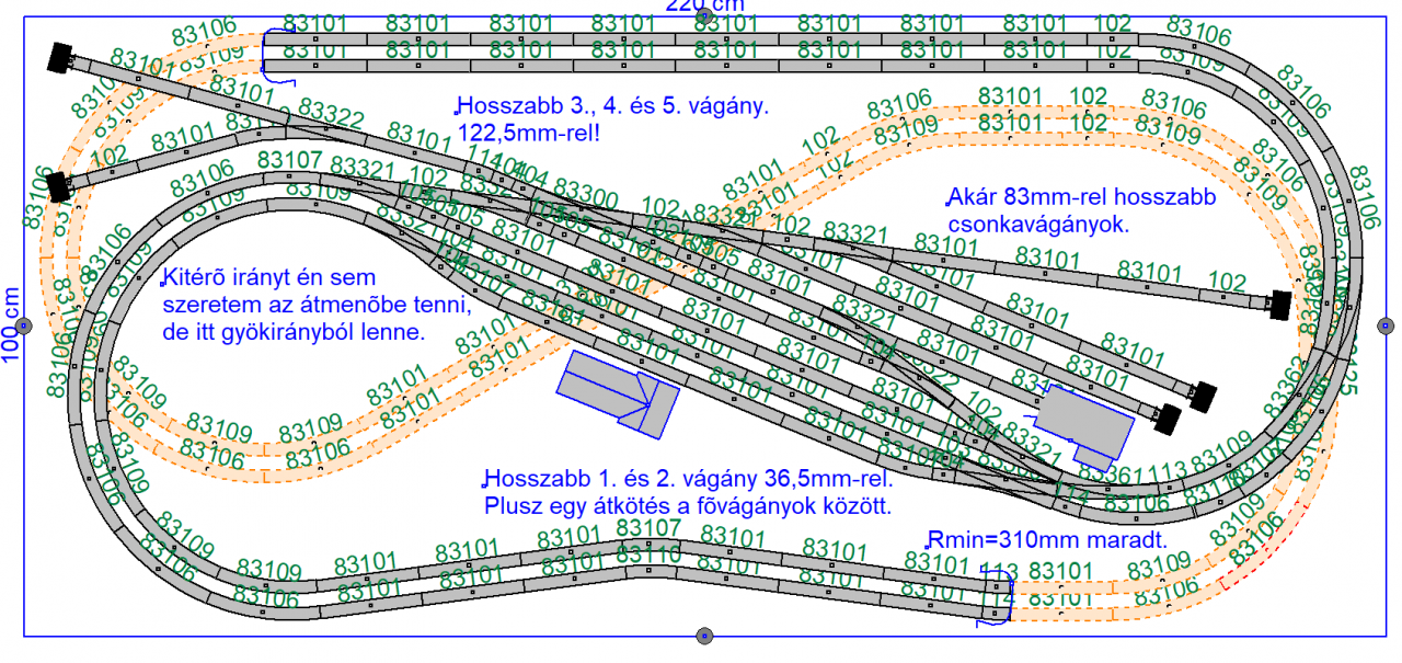 Legkisebb sugár maradt 310mm, erre vigyáztam. Azért is került "eggyel" kijjebb az íves váltópár az állomástól.