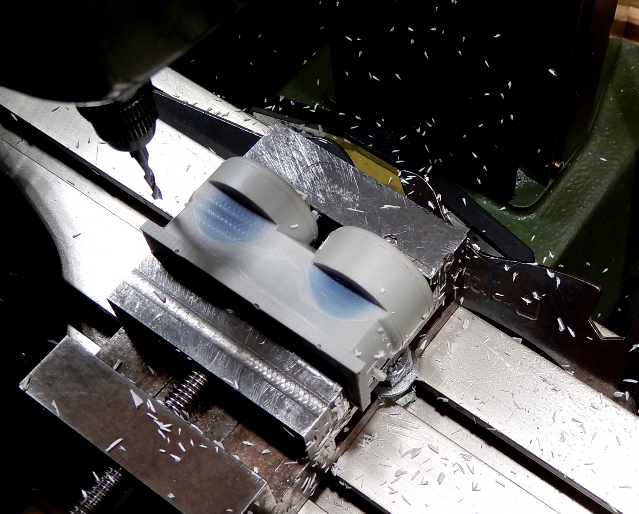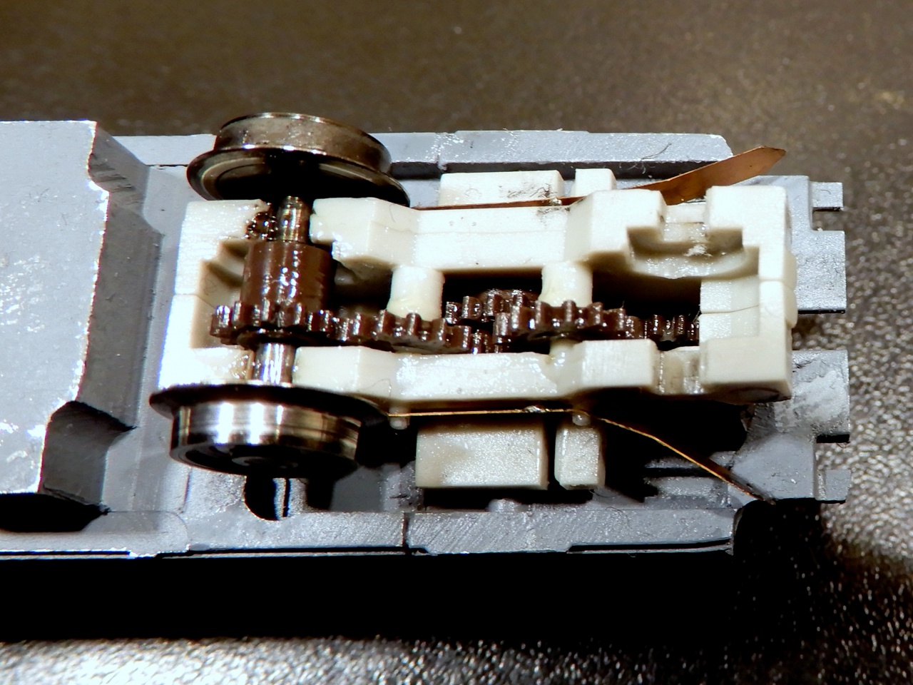 Elérte azt az időt, túl van már egy 70 órás futásteszten az M44-es alá a Poschmodell által leöntött Tillig klón forgóvázlehajtás, hogy belenézzek. Sokkal jobb a helyzet, mint vártam! Igazából kopásnak semmi nyoma, csupán a tengely alatt látni egy pici kifényesedett részt, de az is inkább a tengely végezte polírozás. Döccenés nem érzékelhető a felületen. |
