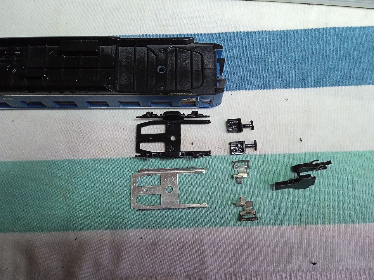 Az első képen látszik, hogy a kocsikapcsoló nem a forgóvázon van immár, hanem a kocsi alvázához van rögzítve. A kivágások miatt a forgóváz szabadon tud mozogni. Az eredeti, csőszegecses forgóváz rögzítés helyett egy M2*6mm csavart és anyát alkalmaztam. A PEHO101 kinematikát a csomagban talált, gyár által mellékelt kétoldalas ragasztóval rögzítettem. Az ütközőket, és a lépcsőket pedig fogpiszkáló hegyével felvitt pillanatragasztóval.