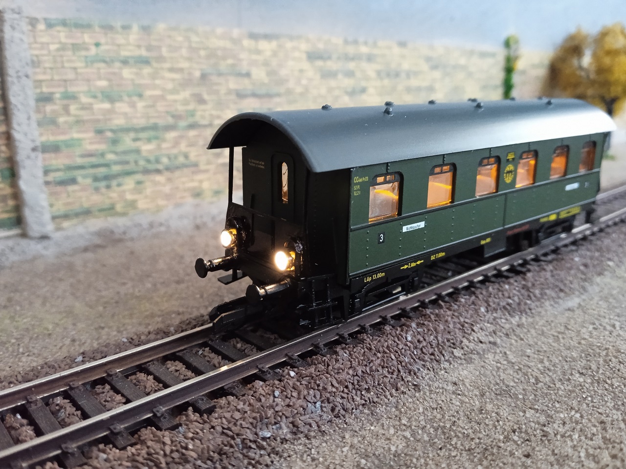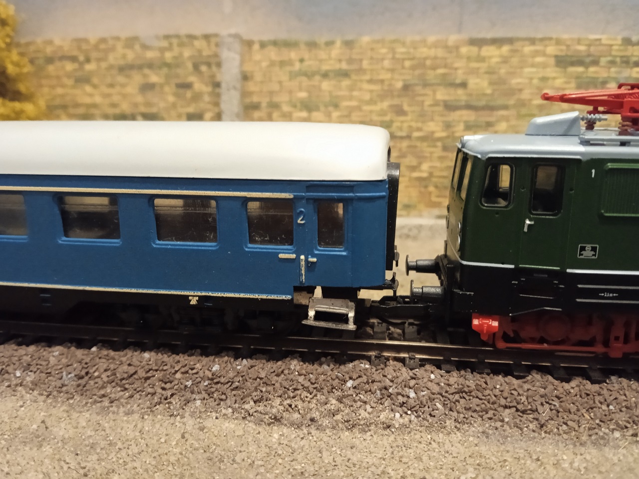 A második kép a próba, egy Tillig E42 mögött. Csodákat azért ne várjunk, habár az eredeti állapothoz képest nagy az előre lépés. Ez a kocsi modell még azért távolról sem annyira precíz, mint egy mai Tillig, vagy akár az első Zeuke Y kocsik! Így ahhoz, hogy üzembiztos legyen egy ilyen modell futása, sajnos kell némi kompromisszum. |