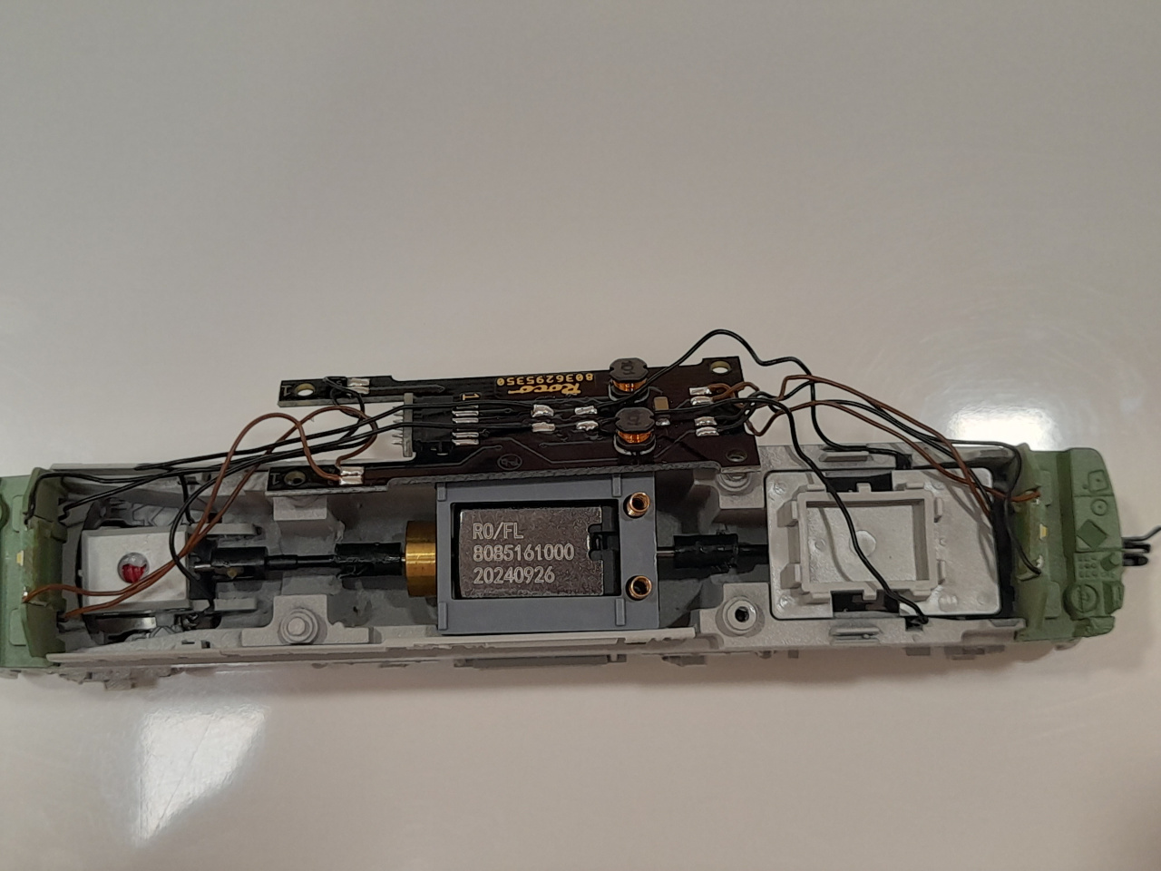 Otthon a szokásos bejáratás megtörtént, de a mozdony menettulajdonságai csak nem javultak. Egy bizonyos fordulaton még egy ciripelő hang ja is lett. Nem érdekelt a garancia, a kasztni festése hibátlan úgy hogy megbontottam. A békebeli roco cirmos festésű már 2.volton szépen elindult .Ez a mostani 4-5 volt körül gondolkodik hogy elinduljon. Óvatosan szétszedtem ,majd jött a káromkodás. Hogy lehet ilyen kis nyamvadt kis motort betenni egy 6.teng mozdony meghajtására. Már az is árulkodó a motor végén lévő minek nevezzem, lendítőkerék. Bosszantó, megveszel 87000 FT-ért egy mozdonyt és most még én rakjak bele még régről megmarat békebeli roco motort. A régi és a mostani ugyan azon a feszültségen teljesen más sebességen haladnak ,ami nagyon zavaró. Pedig ez idáig Roco fan voltam, ez most hatalmas vissza lépés. Kíváncsi lennék másoknak a véleményére is. A BR, és a CSD mozdonyokba is ezek vannak benne ,vagy csak minket Magyarokat örvendeztettek meg ezzel szutyok motorral?   |