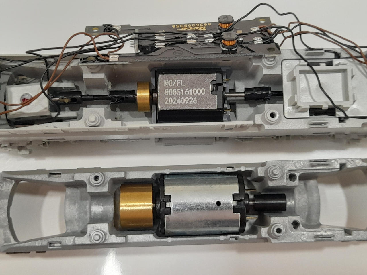 Ráadásul a régi motor ebben a modellben - meg a Ludmillában, a H0-s V36-ban, stb - cserélhető kefés volt, ergo, ha keservesen is, de javítható. Ez az új, ez már nem... Ez, ha elkopik benne a kefe helyetti valami, vagy belejut a zsír, akkor jó eséllyel kuka, mert ugyanaz a gagyi Mabichi klón gyártástechnológia van mögötte, mint amiért szidom a PIKO-t is, mint a bokrot.