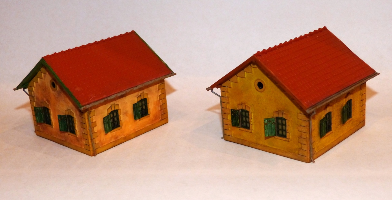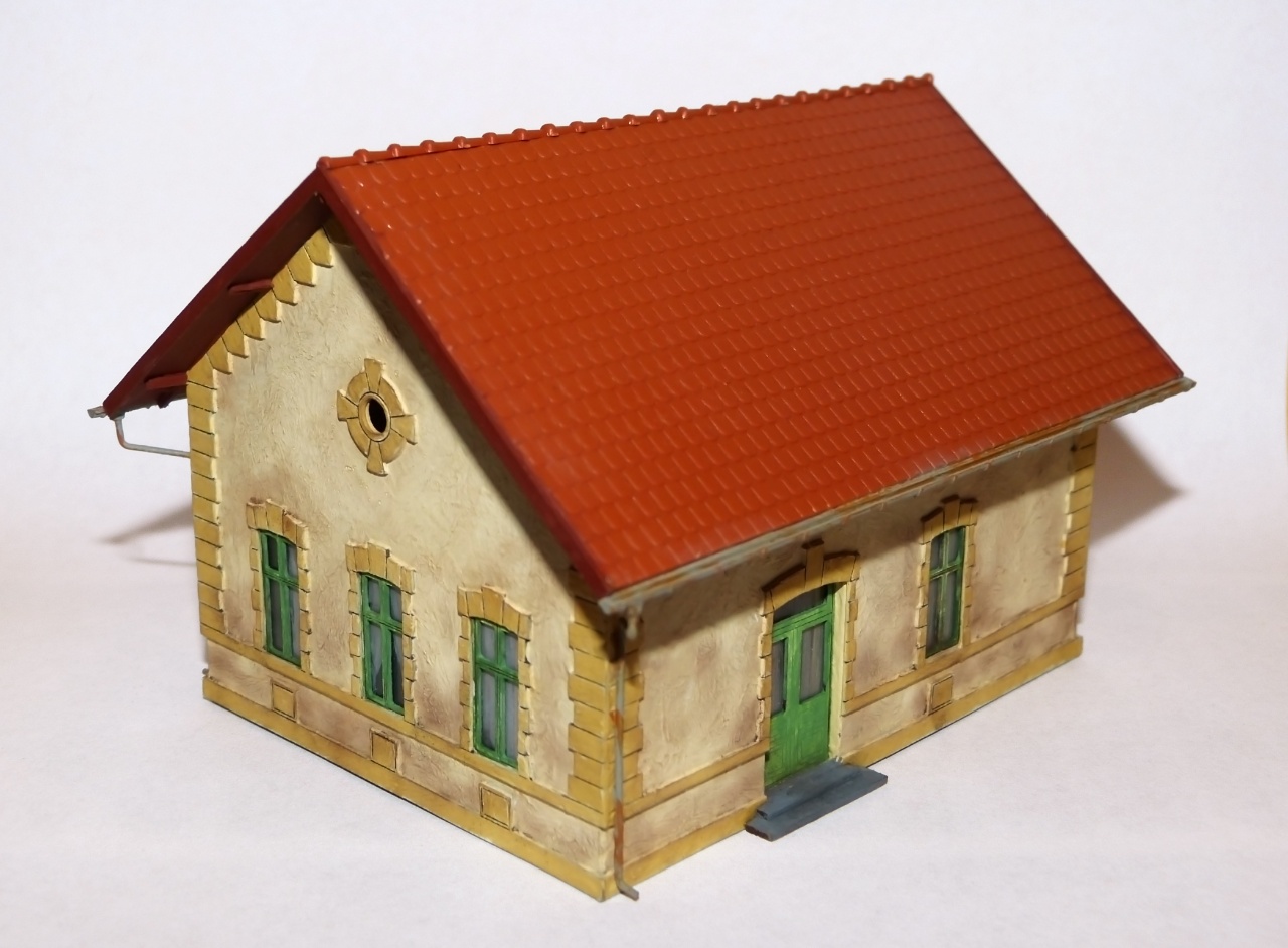 Felkerültek a zsaluk és jól összekoszoltam a homlokzatokat. A tető festése és a kémények még hátravannak.