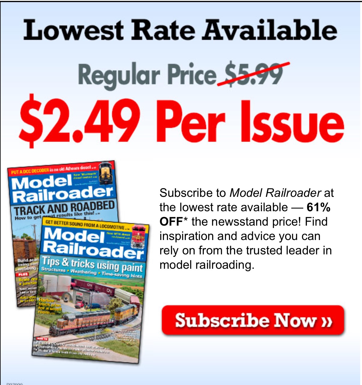 Szomoru látni a világ legnagyobb modellvasuti szaklapjának a vergödését. Mostanában ünneplik a Model Railriader ujság 1000. számát, s közben olyan ajánlatok jönnek, higy a lap darabja alig 2,50$ ( a normális ár alig 40%-a), s ráadásul a néhai, gyakran több mint 200 oldalbol manapság még 100 sem maradt. Ehhez jön, hogy az amerikai kontinensen még konkurencia is alig van. Tudtommal havonta csak egy másik modellujság jelenik meg, meg egy elektronikus formában.