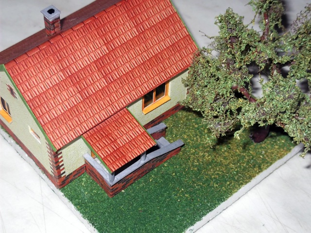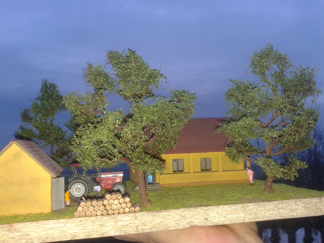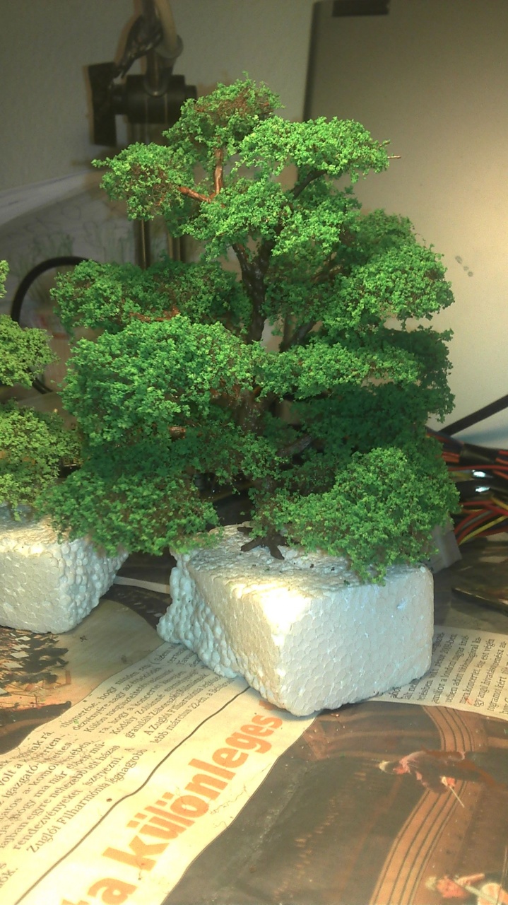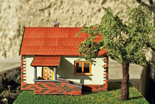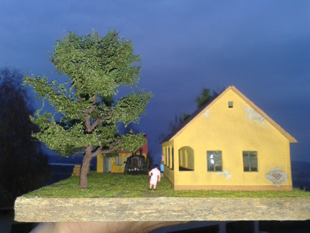 Egyébként meg a fa mellé tettem a kis házikómat és így már nem is olyan rossz. persze azért így is látom a hibákat, pl: fényes törzs és nem igazán jó levélzet szín. A levélzet egyébként festett fűrészpor.