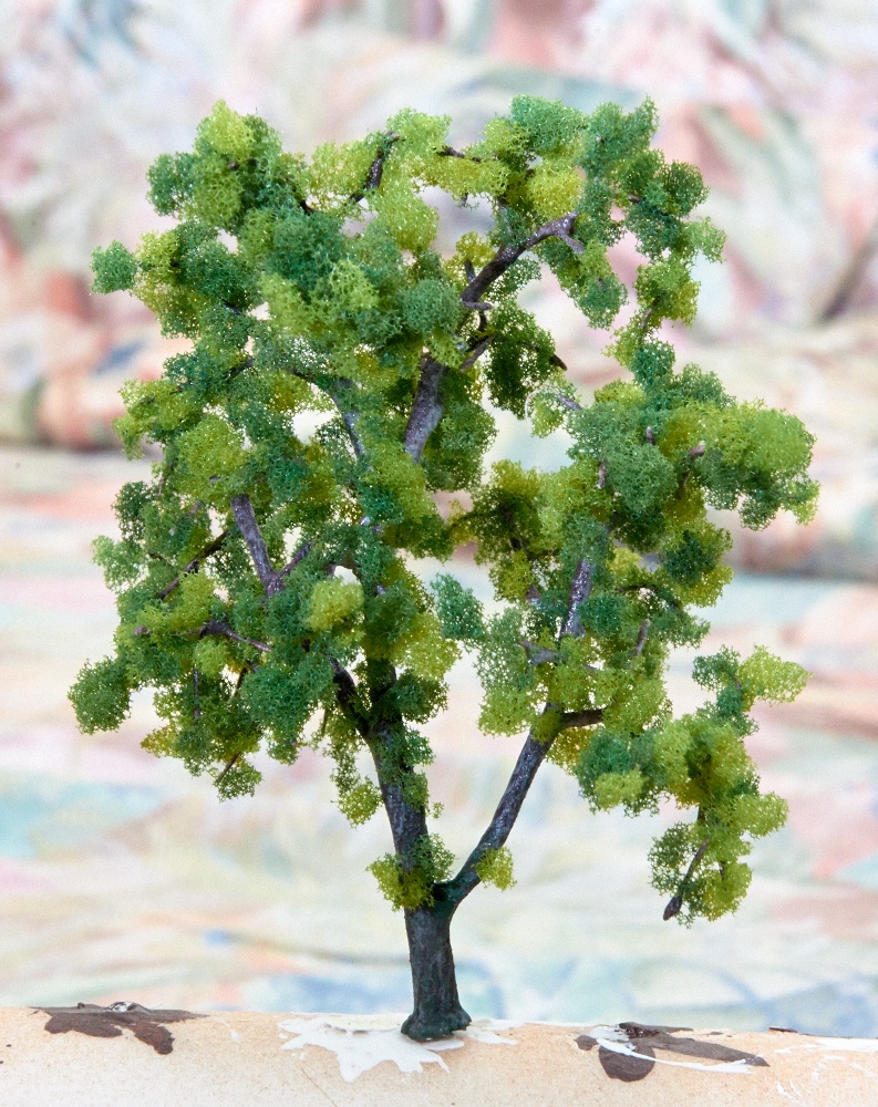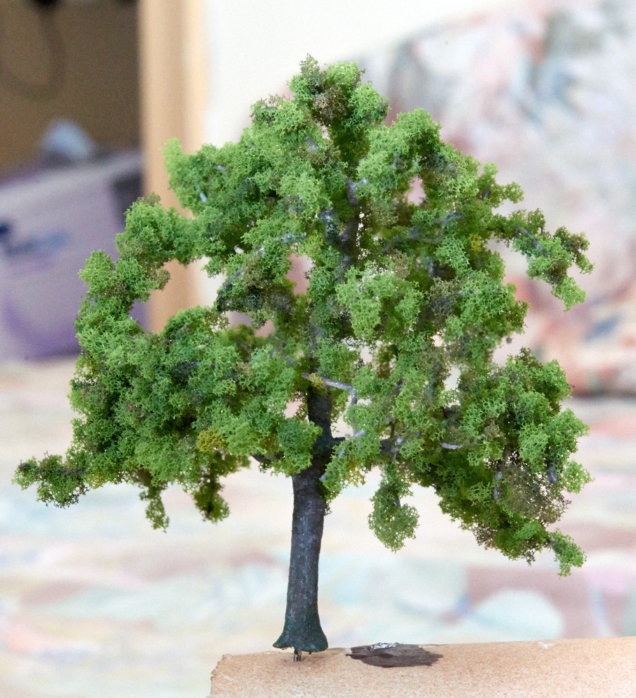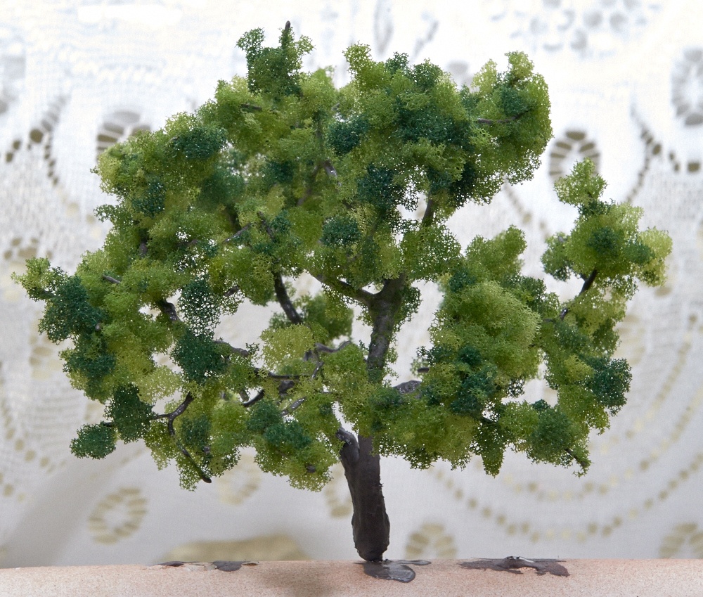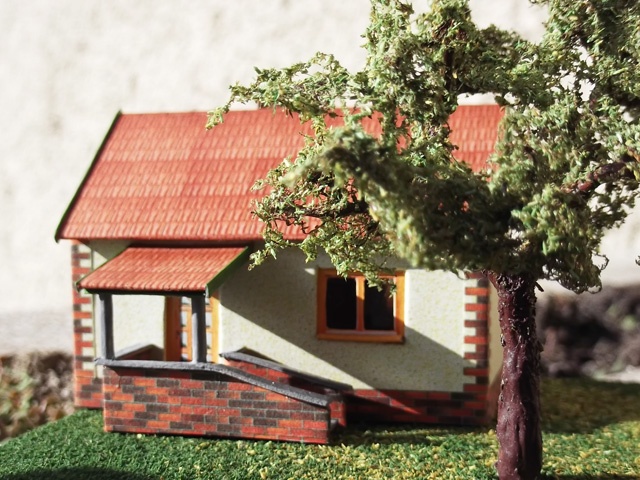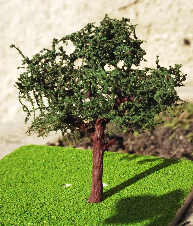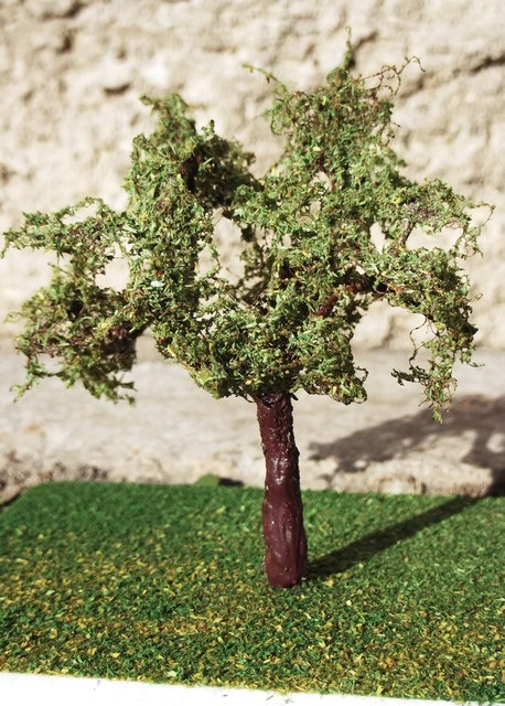 Egyébként meg a fa mellé tettem a kis házikómat és így már nem is olyan rossz. persze azért így is látom a hibákat, pl: fényes törzs és nem igazán jó levélzet szín. A levélzet egyébként festett fűrészpor.