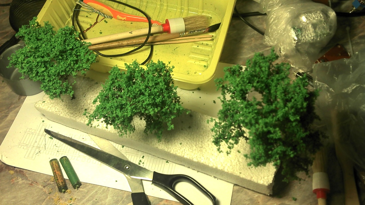 A szivaccsal az a baj, hogy nem szabad közelről nézni. Messziről nézve a valódi lombozat is "masszává" olvad össze, de közelről nem az igazi (szerintem). Én is próbálkoztam vele, de ha egyszer eljutok az asztal építéséig, szórható lombanyagot fogok használni.
