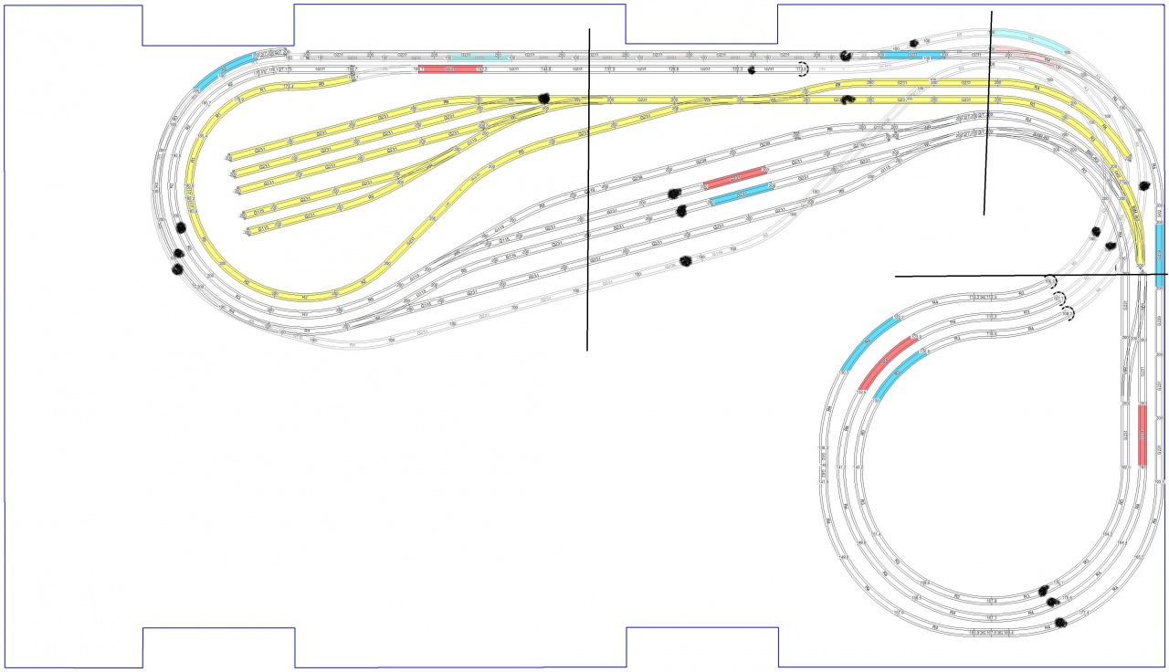 Fekete vonallal az asztalrészeket jelöltem. Négy részből áll az asztal. A faszerkezet, töltés úgy készül/készült hogy abban a síkban vágtam mindent. A sin egyenlőre nem lesz elvágva. Ha egyszer szét kell szedni, a sineket majd akkor vágom.