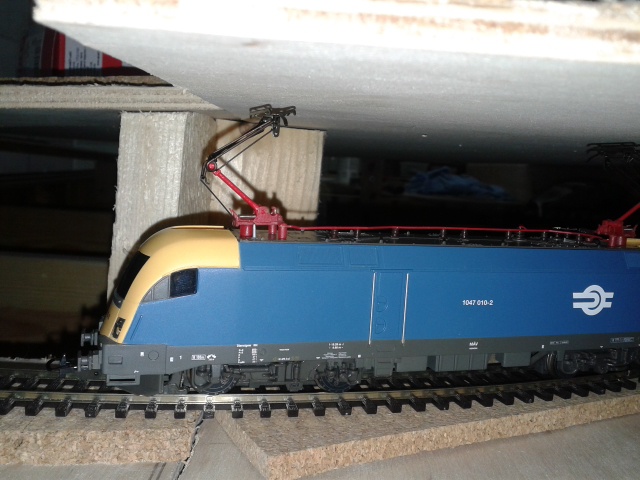 A hétvégén eljutottam a felső szint kialakításáig. Most dőlt el mennyire sikerült jól kialakítanom a magasságot. Nettó (sinkoronától a plafonig) 83mm. Egy Taurus volt a méretpróba. Lecsukott áramszedővel 28 mm, nyitott áramszedővel 4mm maradt a "plafonig". Szerintem nem rossz, figyelembe véve, hogy felsővezetéket nem akarok (persze akkor sem lenne ennyire fent a pantográf).