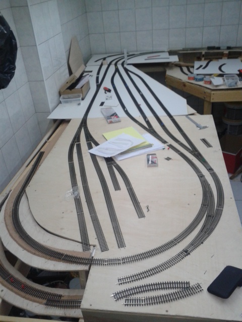 Viszont egy dolog most tünt fel. Korábban a kép előterében lévő két íves váltót a hátsó részen lévő ívben helyeztem el. Ahogy élőben megláttam úgy ítéltem meg, hogy ott hátúl eldugott helyen lenne a legtöbb váltó, itt elől meg szinte semmi. Úgyhogy a két íves szakaszt megcseréltem, így a látvány is "izgalmasabb".