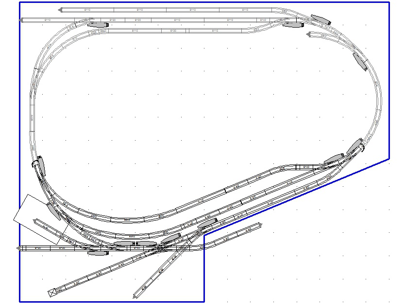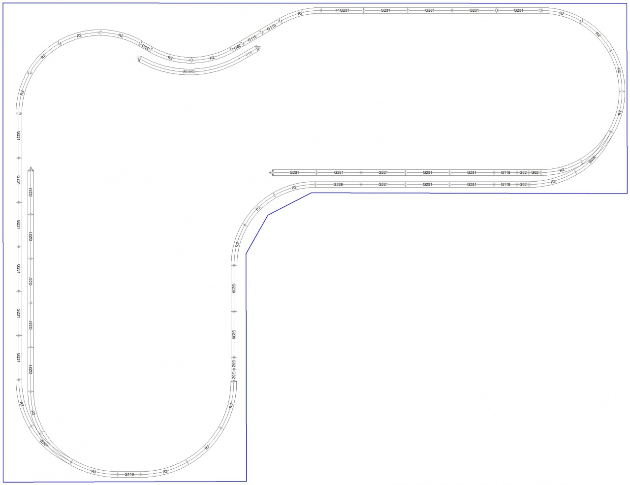 Plusz szeretnék véleményeket kérni a jelenlegi pályatervről. (A SCARM ingyenes verzióját használtam, így csak 2-3 mentésbe fér el a teljes terv.) Az alap koncepció a Höhe Tanne pályatervből indult ki, de az ovál + S-alakú mellékvonal séma már agyon lett használva, ahogy látom, plusz jobb oldalon túl szűk a hely a mellékvonal állomásból történő kiágaztatásához. Így jött az ötlet a jobb hátsó rejtett kiágazásra, valamint a két körös emelkedőre, hogy így is meglegyen a kellő szintkülönbség.