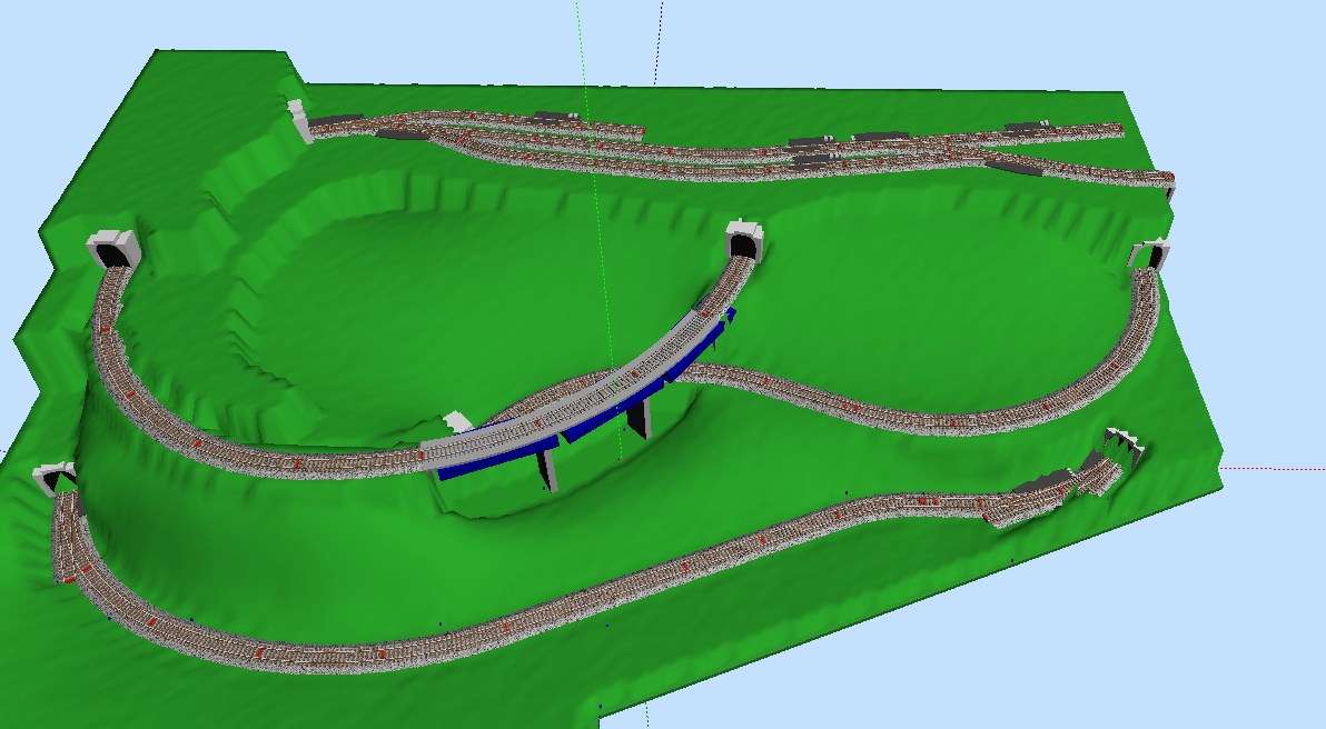 Az alsó állomás 3 átmenő vágányos (50 cm, 85 cm és 100 cm hasznos vágányhosszal), maga az állomásépület a levehető részen lenne jobb alul egy kis városrészlettel együtt. A csonkák, fűtőház elrendezésére több ötlet is van, a képen látható csak az egyik kb. 4-5 közül. A rejtett tároló állhat 2 átmenő vágányból és egy hosszú csonkából vagy akár 3 átmenő vágányból is. Az alsó állomáson és a rejtett tárolóból is lenne kiágazás balra későbbi esetleges bővítéshez vagy vonatkazetták használatához. A mellékvonal jobb hátul indul és két kört megtéve jut fel a felső állomáshoz. Két látható szakasza van, a második egy íves völgyhídon keresztezné az elsőt. Fent kis két vágányos állomás egy enyhe ívvel kicsit feldobva (hasznos vágányhossz kb. 55-55 cm). Az állomásépület hátul lenne pár kis házzal (házak kulisszáival). A két látható állomás közötti terület sziklás-erdős tájjal lenne kitöltve nagyon kevés épülettel (esetleg erdészház, vízimalom, ilyesmi) a zsúfoltságot elkerülendő/csökkentendő.